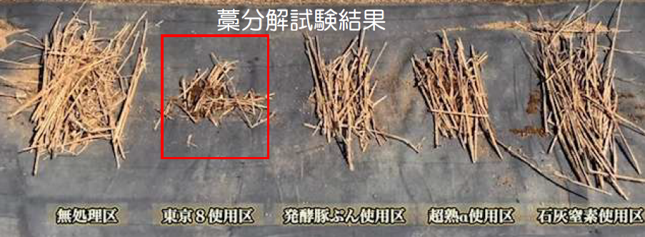 左から:無処理区・東京8使用区・発酵豚ぷん使用区・超熟α使用区・石灰窒素使用区。東京8使用区(赤枠)の分解が顕著。