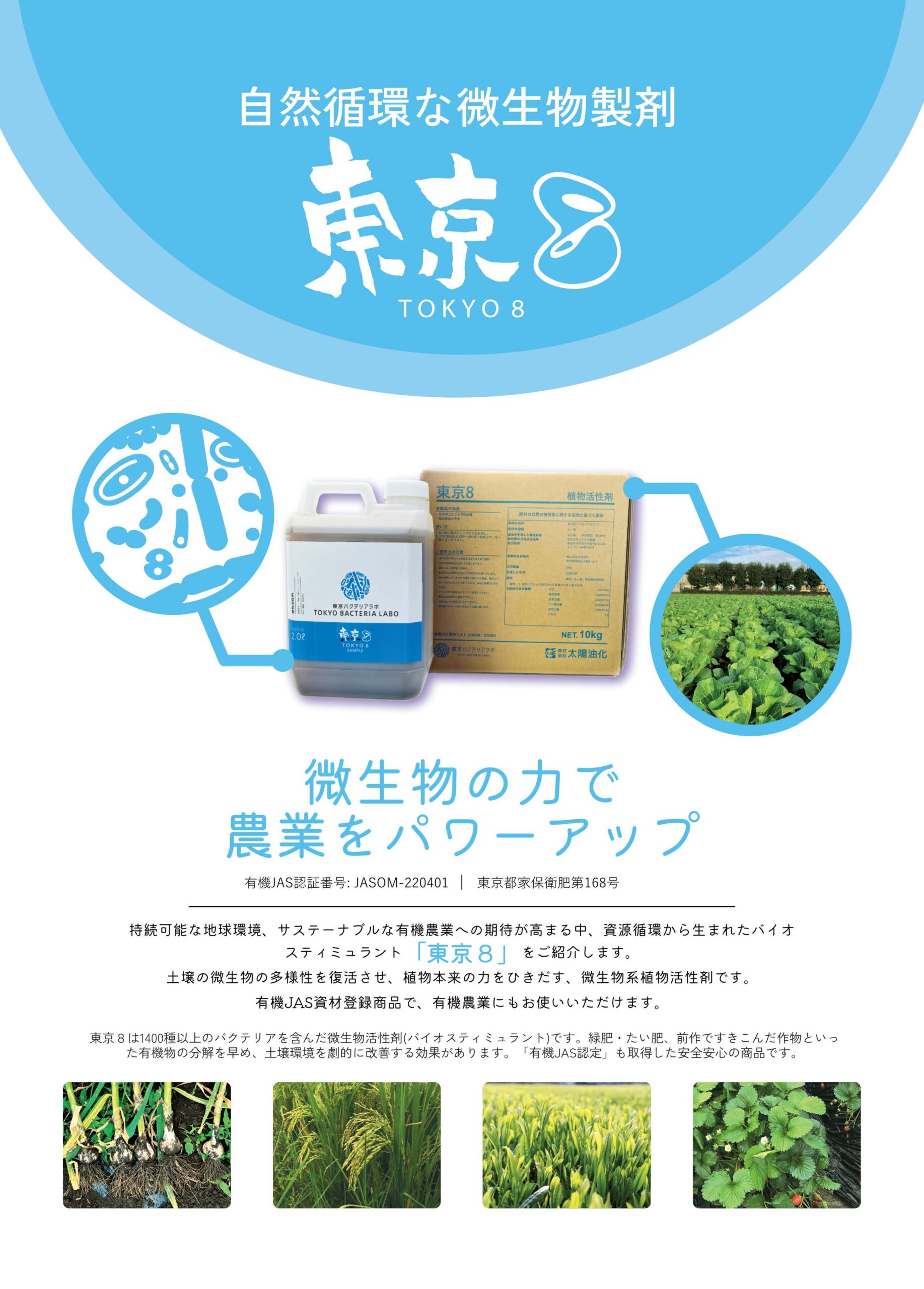 「東京8」は、バイオスティミュラント(BS)資材に分類される土壌微生物資材です。1,500種類の有用微生物を含み、特に残渣・有機物の分解を得意とするバチルス属が豊富。散布するだけで土の中の分解活動を活性化します。