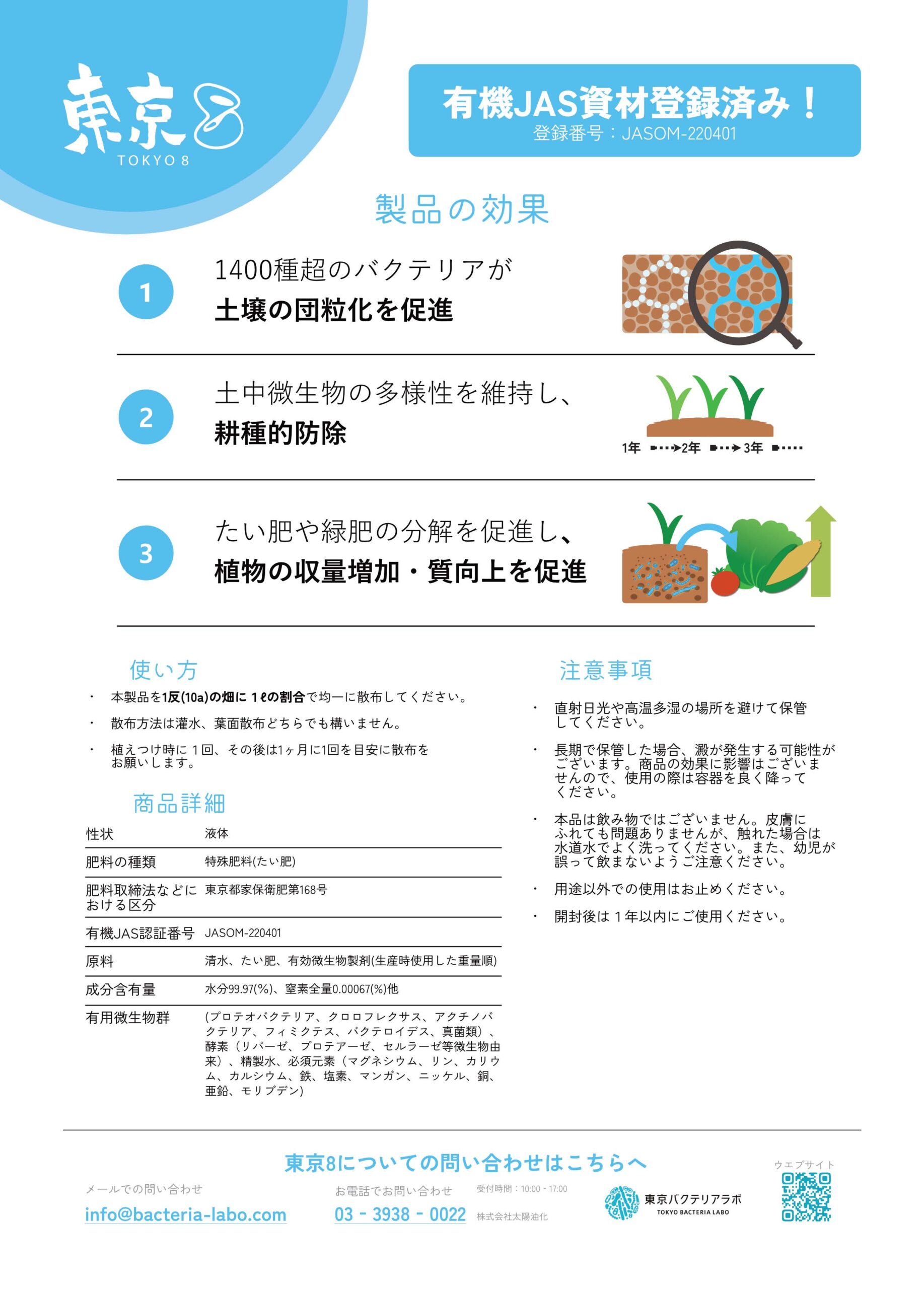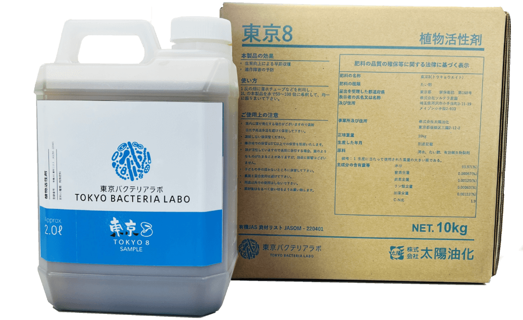 『東京8(東京エイト)』は、東京都内の汚泥処理を35年以上手がける株式会社太陽油化が、長年の微生物研究から生み出した植物活性剤(バイオスティミュラント資材)です。1400種超の多種多様なバクテリアが集団で働き、土壌の団粒化を促進しながら根が育ちやすい土壌環境へと改善します。